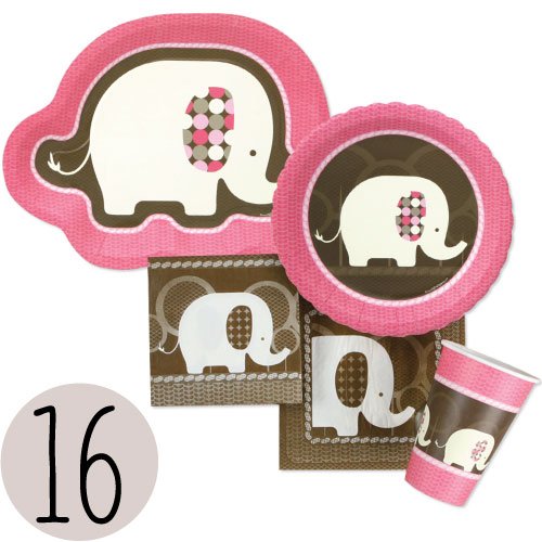 16 Pink Elephant Bundle Perfect Party Pack! You'll receive: 16 dinner plates, 16 dessert plates, 16 luncheon napkins, 16 beverage napkins and 16 cups.