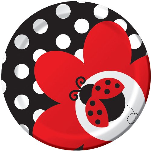 Ladybug themed small round dessert plates 7-Inch round plate 8-Count; makes clean-up a snap Perfect supplies for a child's birthday party, a baby shower or just to have for the occasional play date or picnic! See Creative Converting's coordinating line of party goods and dinnerware