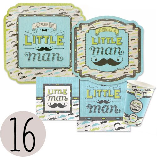 16 Dashing Little Man Bundle Perfect Party Pack! You'll receive: 16 dinner plates, 16 dessert plates, 16 luncheon napkins, 16 beverage napkins and 16 cups.